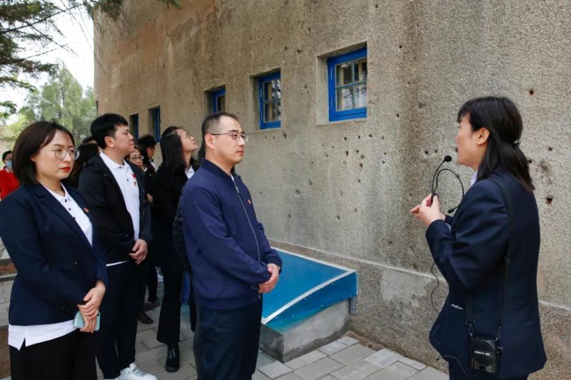 在配水池战斗遗址“弹痕墙”前聆听党课