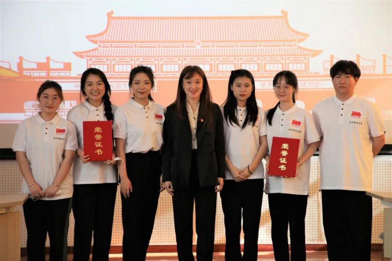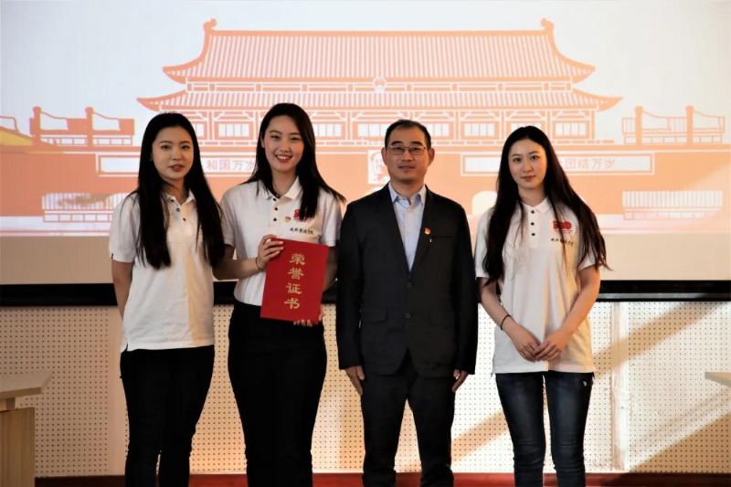 戏剧影视学院党总支第一党支部书记宋颖、第四党支部书记肖晓阳为获得三等奖的参赛队伍颁奖