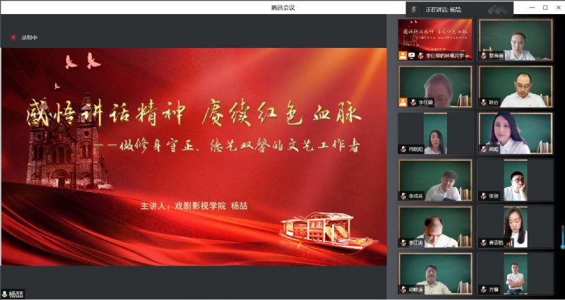 交流发言结束后,戏剧影视学院院长杨喆作了题为《感悟讲话精神 赓续红色血脉 做修身守正、德艺双馨的文艺工作者》的辅导报告。他分别从“毛泽东同志《在延安文艺座谈会上的讲话》——开辟中华文艺新纪元”“习近平总书记在文艺工作座谈会上的讲话——开启伟大复兴的文艺新征程”“修身守正、立心铸魂,做一名德艺双馨的新时代文艺工作者”三个方面,带领广大教师回顾并深入理解毛泽东同志《在延安文艺座谈会上的讲话》和习近平总书记关于文艺工作重要论述的深刻内涵,阐述了文艺和文艺工作的地位、作用和重大使命。他指出,作为新时代的文艺工作者,必须有“铁肩担道义”的社会责任感,努力创作无愧于时代、无愧于人民的优秀作品,用明德引领风尚,把个人的艺术追求、学术理想同国家前途、民族命运紧紧结合在一起。最后,他号召广大教师在艺术道路的前行过程中,一是要常亮“追求灯”,把为人、做事、从艺统一起来,做到修身守正、德艺双馨;二是要常亮“责任灯”,坚守社会表率的责任担当,以更多鲜活人物形象和精品力作回馈时代、回馈人民,肩负起用先进文化培根铸魂的职责;三是要常亮“底线灯”,要树立知法懂法守法的法治思想,心存敬畏、行有所止,记住红线、守住底线,以实际行动传承《讲话》精神,做一名有信仰、有情怀、有担当的新时代文艺工作者。