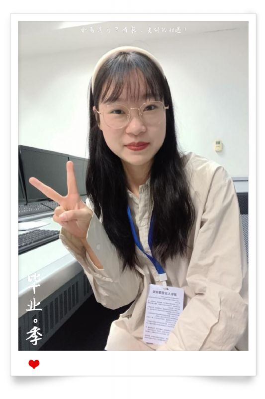 邵会婷:岁月不居,时节如流,四年大学光阴转瞬即逝,携稚嫩而来,满载成长而归,过往的一切回忆在脑海中一帧帧播放。感谢老师们的教导,使我变得更加优秀。在学校的四年,是积蓄能量、破茧成蝶的四年。而今,作为一名应届毕业生,我即将跃入人海,迈向新征程,既承载着母校的期待,也承担着时代的责任。未来,我会努力成为一个更“丰富”的人。天下没有不散的宴席,但人生何处不相逢。愿我们迈出校门以后都能拥有熠熠生辉的人生。