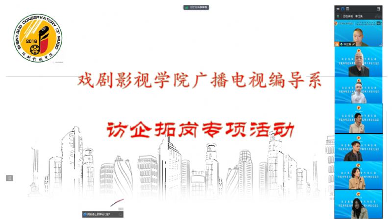 同时,广播电视编导系还通过线上方式与辽宁国仁康科技有限公司、宪帅文化传媒有限责任公司、沈阳天鹞电子商务有限公司、辽宁广播电视台、深圳市壹嘉星影视文化传媒有限公司五家企业开展了“访企拓岗促就业”专项行动。会议上,五家企业分别介绍了公司的基本概况与岗位人才需求,广播电视编导系主任李江涛详细介绍了系内人才培养情况和专业特色。双方表示将持续深入合作,共同促进毕业生高质量就业,并探索校企合作模式创新。
