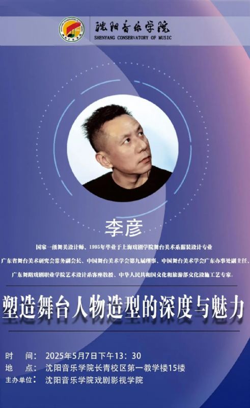 5月7日,广东省舞台美术研究会常务副会长李彦将做客沈阳音乐学院戏剧影视学院,作题为《塑造舞台人物造型的深度与魅力》的学术讲座,进一步促进戏剧与影视学学科建设与专业教学,助力戏剧影视美术设计人才培养质量稳步提升。