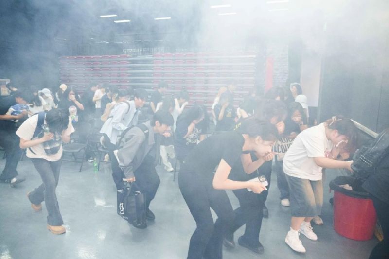 模拟疏散演练过程中,师生们用湿毛巾捂住口鼻,保持低姿,按照预定逃生路线迅速撤离至安全区域,到达集合点后清点人员,并向演练总指挥报告情况。整个疏散演练过程行动迅速、紧张有序。