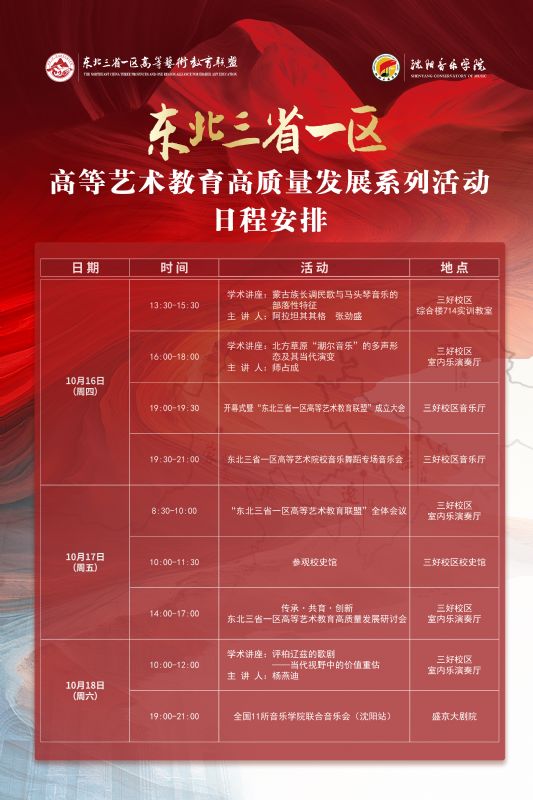 共同推动东北三省一区高等艺术教育的高质量发展,沈阳音乐学院将于10月16日至18日举办东北三省一区高等艺术教育高质量发展系列活动。