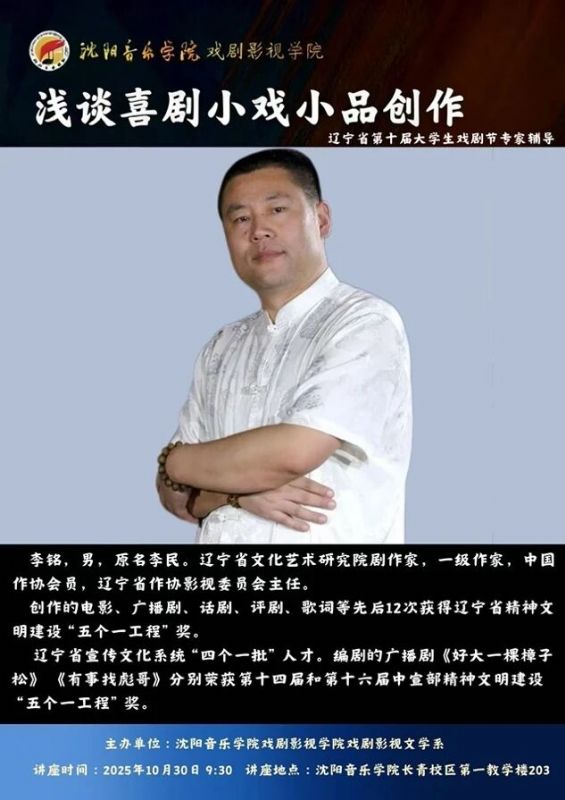 10月30日,辽宁省文化艺术研究院剧作家、一级作家、辽宁省作家协会影视委员会主任李铭将做客戏剧影视学院,围绕喜剧小戏小品的创作方法与编写技巧这一热门话题,为广大师生带来一场精彩的学术讲座。