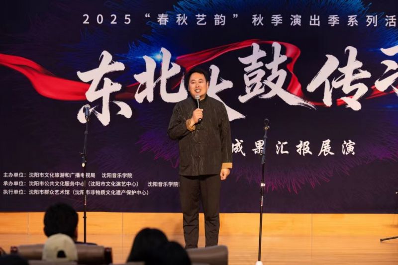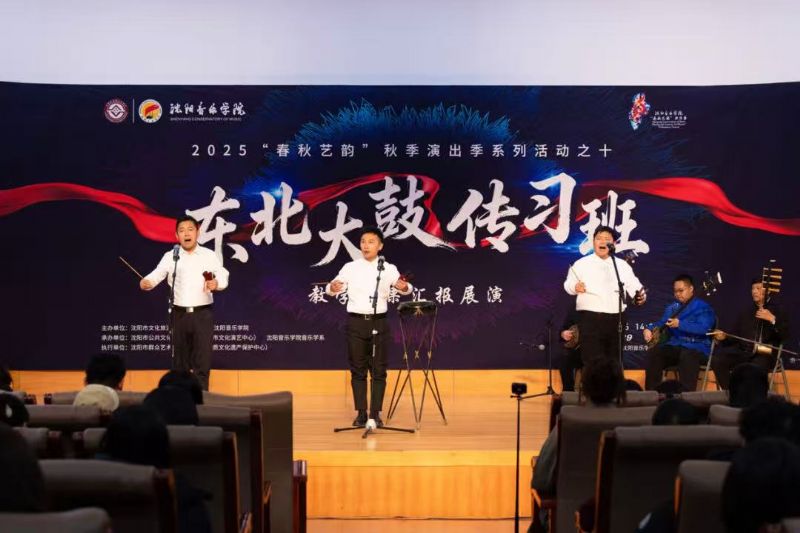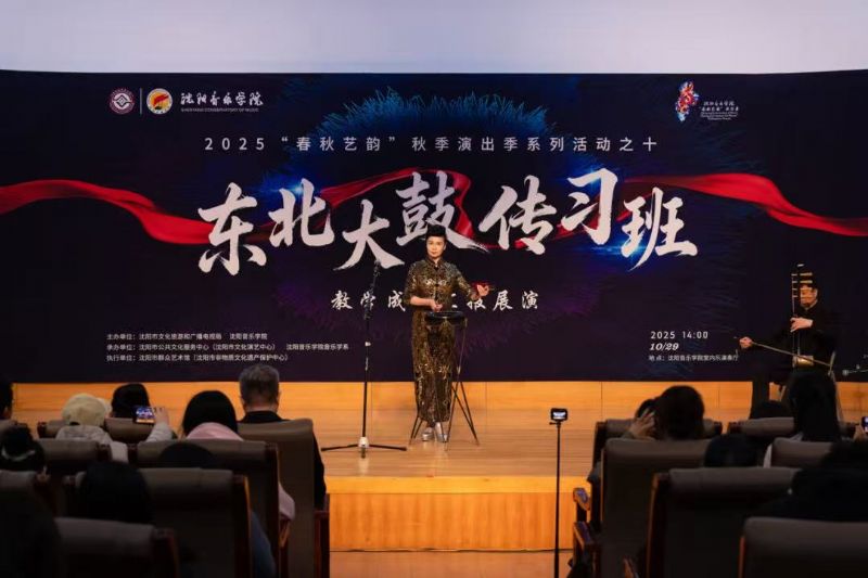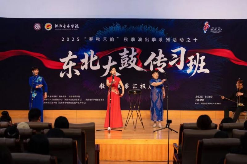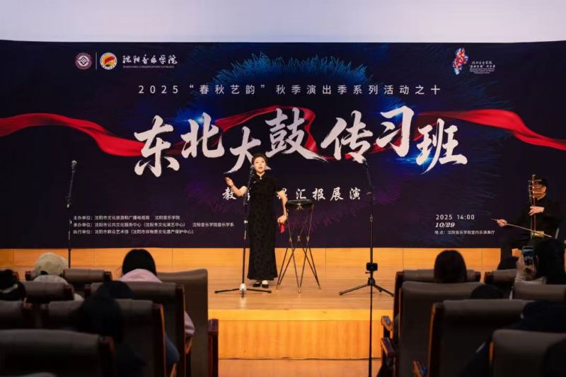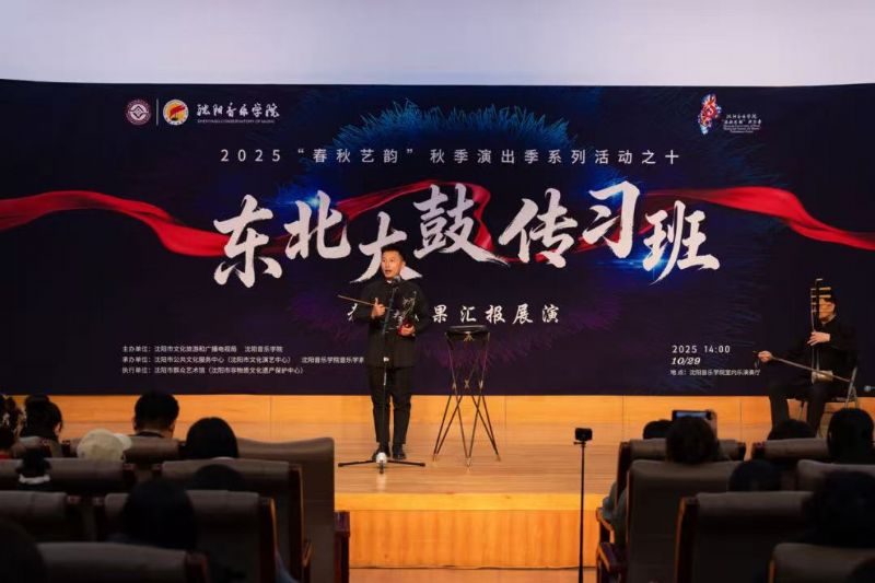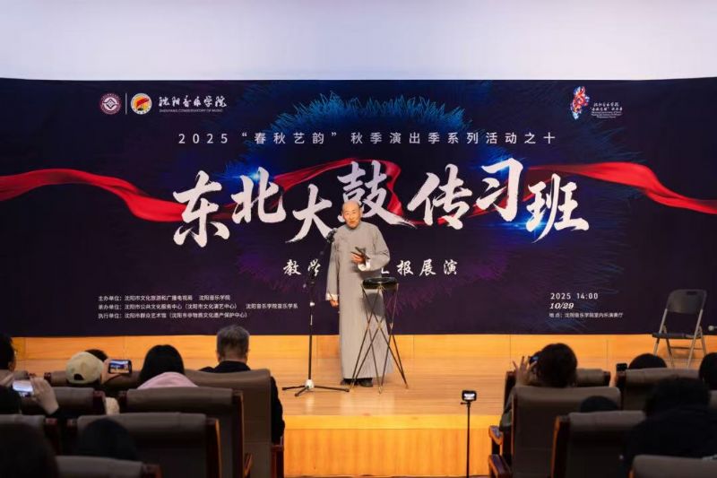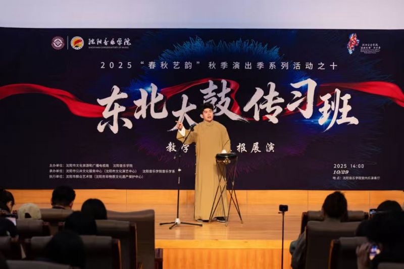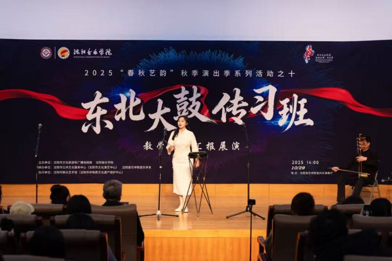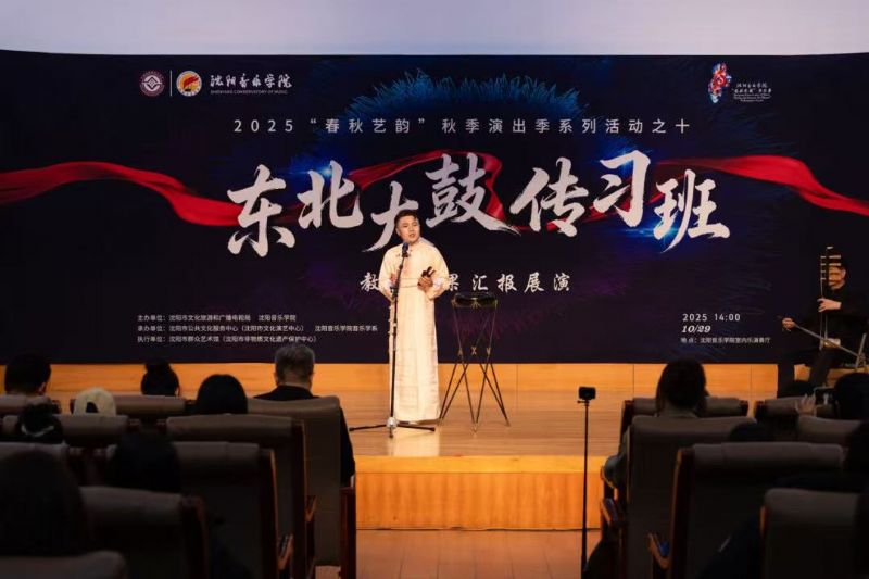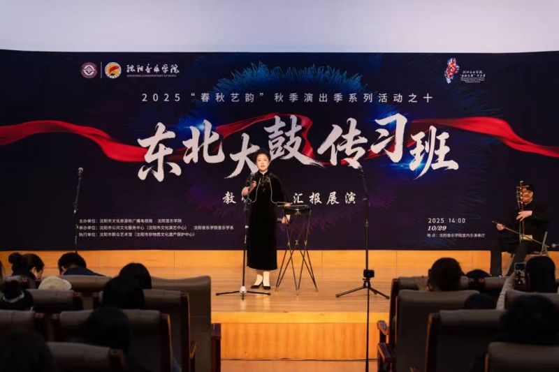 10月29日,由沈阳市文化旅游和广播电视局与我院联合主办,沈阳市公共文化服务中心(沈阳市文化演艺中心)、沈阳市群众艺术馆(沈阳市非物质文化遗产保护中心)、我院音乐学系共同承办的东北大鼓传习班教学成果汇报展演在学院成功举行。东北大鼓老艺术家与优秀学员代表同台献艺,以精湛技艺为现场观众奉上了一场精彩纷呈的鼓曲盛宴。沈阳市文化旅游和广播电视局副局长惠锋、学院院长助理刘小龙等领导嘉宾与学院音乐学系百余名师生共同观看了展演。