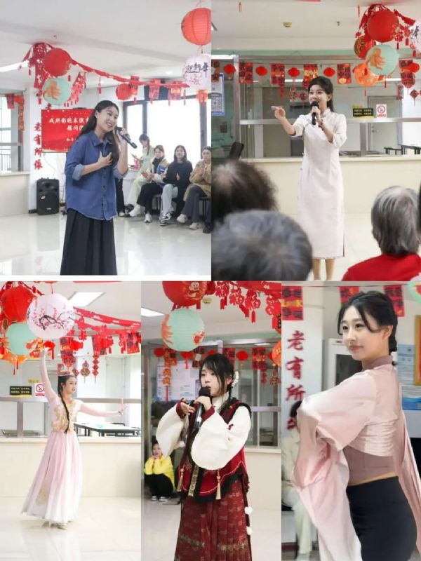 活动中,师生们立足专业所长,带来经典戏曲选段、耳熟能详的红色歌曲演唱等特色节目。欢乐温情的演绎让老人们的脸上绽放出灿烂笑容,阵阵热烈掌声为现场增添了浓厚的互动氛围。令人动容的是,老人们也主动献上两个精心准备的节目,字里行间的真挚情感与历经岁月沉淀的从容风采,深深打动了在场每一个人。当师生与老人们携手完成表演时,不少学生热泪盈眶,心灵受到深刻触动,真切体悟到岁月沉淀的生命厚度与向阳而生的生活热忱。表演之余,大家围坐促膝长谈,倾听老人们的人生故事;细致整理房间,打理生活琐碎,以点滴行动传递陪伴的温暖,让志愿服务不仅成为专业实践的延伸,更化作传承尊老敬老美德、厚植家国情怀的生动课堂。