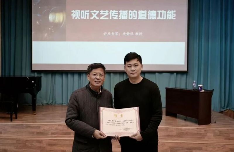 讲座前,朱晏锋为庚钟银教授颁发辽宁省高等学校新型智库沈阳音乐学院戏剧影视学科研究中心专家聘书。