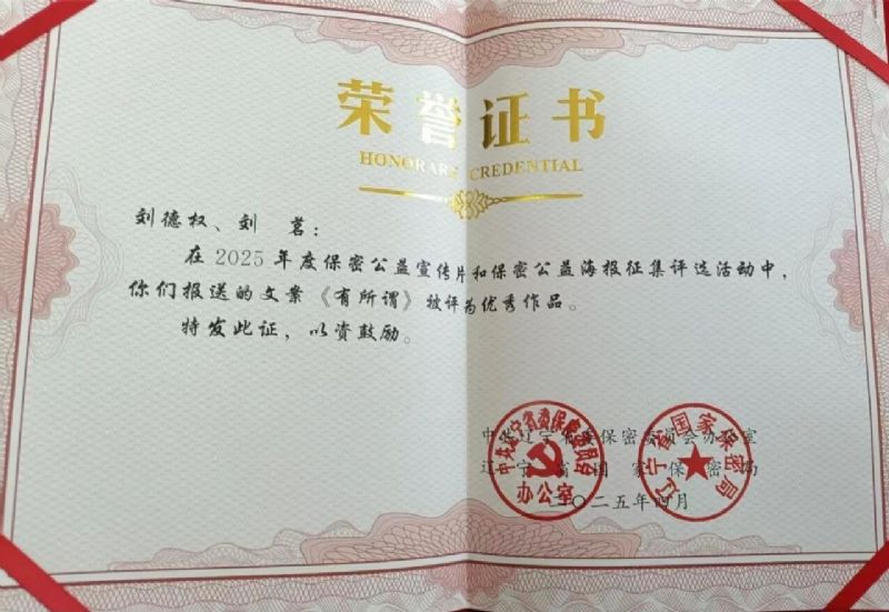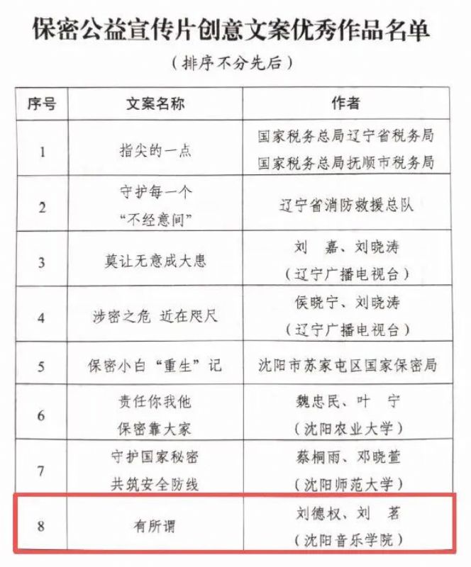 近日,在由辽宁省委保密办(省国家保密局)主办,辽宁省教育厅承办的“2025年度保密公益宣传片创意文案和保密公益宣传海报征集评选活动”中,我院戏剧影视表演系教师刘德权、刘茗的文案《有所谓》被评为保密公益宣传片创意文案优秀作品。沈阳音乐学院荣获“优秀组织奖”。