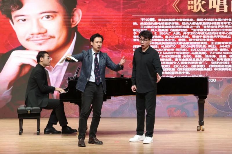 王云鹏是国际知名的旅美男中音歌唱家,现任星海音乐学院声乐歌剧系主任、教授,曾入选《金融时报》“全球最受瞩目的25位中国人”名单,被《歌剧新闻》誉为“歌剧世界令人振奋的新声音”。讲座中,王云鹏结合自身丰富的艺术实践与教学经验,以深入浅出的语言、生动鲜活的案例,系统阐释了歌唱艺术的精髓。他强调,学艺者不仅要锤炼专业技巧,更要注重文化修养与思考能力的提升,唯有如此才能深刻理解作品内涵,实现技巧与灵魂的融合。王云鹏的讲解饱含对声乐艺术的赤诚,既有高屋建瓴的艺术见解,又有细致入微的技巧点拨,令在场师生豁然开朗、受益匪浅。讲座现场示范指导环节,四位同学先后登台演唱中外经典作品,王云鹏逐一予以精准点评、悉心指导。声乐歌剧系学生任建斌分别演唱了中外作品《问》和《复仇》。王云鹏在讲授中让演唱者逐字逐句“说”出歌词,通过这一方式引导学生直观感受气息对声音的支撑作用,深刻理解气息支撑是歌唱的核心基础。民族声乐系学生李文跃演唱了红色经典歌曲《红星照我去战斗》。王云鹏首先对作品的时代背景与情感内核进行了深入剖析,引导演唱者将自身代入歌曲描绘的革命情景与人物身份中,做到“用心演唱、以情带声”。声乐歌剧系学生唐宁泽分别演唱了中外作品《点绛唇·赋登楼》与《刮起一阵不祥的暴风雨》。王云鹏结合演唱者的嗓音特点与两首作品的风格差异,给出了精准指导。他指出男中音演唱者,需找准呼吸与声音通道的结合点,精准控制声音传递的位置,做到“像打子弹一样精准发力”。声乐歌剧系学生孟庆鑫演唱了《再看一眼亲人》与《大江东去》两首风格迥异的作品。王云鹏指出,演唱时要注重情感的自然切换与氛围营造,做到心中有画面、眼中有情感;乐句衔接需自然流畅,避免过度修饰,秉持“说”着唱、唱着“说”的理念,让声音更具感染力。