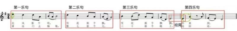 为精准契合“喜儿”亮相时的人物状态与剧情氛围,《北风吹》第一段在完整保留《小白菜》旋律线条的基础上,进行了多维度的创造性改造:其一,在保持徵调式不变的前提下,将原曲独特的5/4混合拍改为流畅的3/4拍,使旋律更具灵动流动感,契合少女“喜儿”的活泼天性;其二,对原民歌的乐句结构进行优化调整,第一乐句经扩充改造后更具表现力,第二、三乐句顺次层层下移,形成富有层次感的旋律走向,第四乐句采用“鱼咬尾”和第三乐句衔接,之后上行四度跳进,既保持了乐句间的连贯性,又形成情感张力,句尾仍保留原曲的质朴韵味,通过柔和的旋律线条与恰到好处的八分休止符停顿,塑造出俏皮灵动的语气质感;其三,将第一乐句的起始音向上提高二度,不仅有效拓宽了音域范围,更让音色变得明亮通透,配合“北风那个吹,雪花那个飘”的三字句歌词结构,形成富有韵律感的节奏变化,增添了舞蹈般的灵动气息。