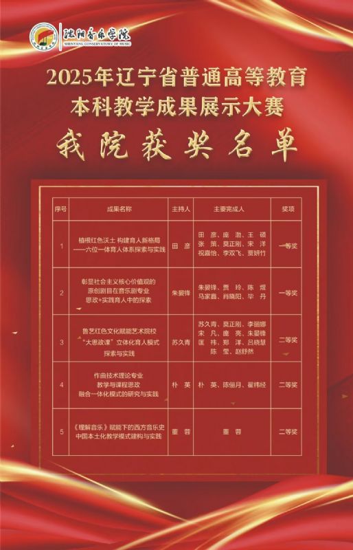 我院此次获奖的5项成果聚焦艺术院校育人特色,紧扣红色文化传承、社会主义核心价值观培育、专业课程思政融合、西方音乐史本土化教学等关键领域,从“教、创、演、学、研、评”六位一体育人体系构建、原创剧目思政实践、大思政课立体化育人、作曲专业教学创新等多个维度,形成了一批可复制、可推广的教学改革实践经验,是我院全体教师深耕教学、勇于探索、聚力创新的智慧结晶,更是我院持续推进本科教育教学质量提升、打造特色艺术人才培养体系的重要体现。