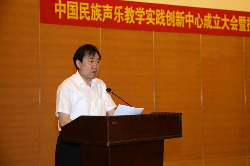 孙华林在仪式上讲话。他表示,沈阳音乐学院的民族声乐专业教育积淀深厚、教育体系完善、教学成果显著,在全国起到引领和示范的作用。辽宁省教育厅批准成立中国民族声乐教学实践创新中心,既是坚持文艺创作的正确方向,也是弘扬民族精神,传承优秀文化的具体举措。同时,作为省级教学实践创新中心与教育部高教司合作共建,不仅体现了教育部对中心和民族声乐教育的支持,也是对辽宁教育事业的支持。沈阳音乐学院要认真贯彻落实习近平总书记系列重要讲话,尤其是在文艺座谈会上讲话精神,不辱使命,发挥优势,突出特色,一定要把中心建设好,要发挥中心教学实践与创新的双重目标,为民族声乐艺术交流提供载体和平台,收获最新的办学理念和先进的教学方法,让民族声乐艺术真正成为辽宁一流、全国领先的创新中心。