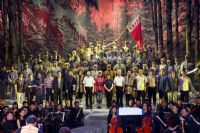 当晚的音乐剧场座无虚席,精心布置的舞台、炫丽多彩的灯光、恢弘壮阔的交响乐,将演出的气氛衬托的浓重、热烈。从“被逼上山”到“寻找游击队”“斗争中成长”“报仇雪恨”,四幕剧情环环相扣、跌宕起伏、引人入胜,剧中人物矛盾也不断激化。李小凤、老李头、杨主任、孙晶石等人物角色陆续登台,演员饱含深情、全心投入的演唱,让大家回顾那段东北抗联历史,共同追溯抗战的轨迹。观众在观看演出的同时,切身感受到东北抗联战士和广大人民面对入侵者的铁蹄蹂躏,誓死抗争的革命精神和深爱家乡、深爱祖国的真挚情怀。精彩的演出让观众在精神上受到一次洗礼,思想上受到一次深刻的爱国主义教育。热烈的掌声贯穿音乐会始终,当《革命人永远是年轻》的经典旋律再次响起的时候,唤起了全场观众的强烈共鸣。观众情不自禁地与台上的演员一起唱起来,那富有感染力的歌声在音乐剧场的上空久久回荡。