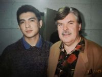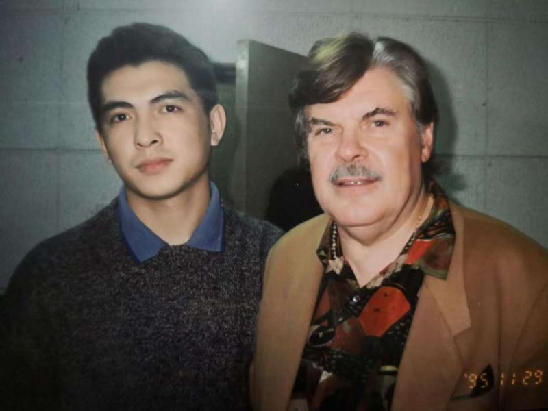 王宇与金石老师(左一)周泰老师 (右一) 于附中原教学楼前合影
