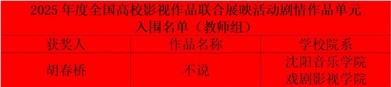 戏剧影视学院影视摄影与制作系主任胡春桥原创作品《不说》在本次推优活动中从1975部作品脱颖而出,获得年度优秀剧情作品(教师组),并入围第四届全国高等院校影视作品联合展映。