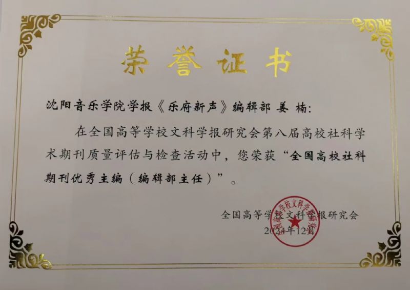 我院学报《乐府新声》编辑部主任姜楠在全国高等学校文科学报研究会第八届高校社科学术期刊质量评估与检查活动中,荣获“全国高校社科期刊优秀主编(编辑部主任)”称号。