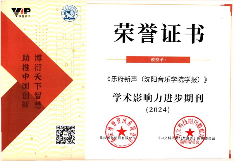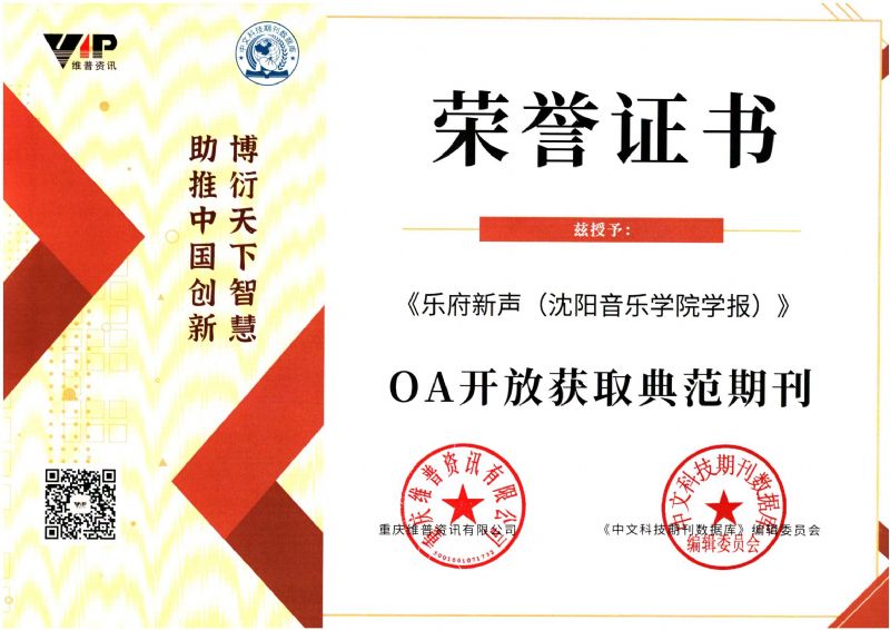 此外,近期《中文科技期刊数据库》编辑委员会与重庆维普资讯有限公司授予我院学报《乐府新声》“学术影响力进步期刊”和“OA开放获取典范期刊”荣誉证书。