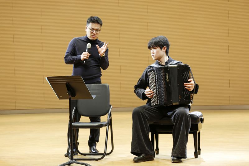 刘睿博士毕业于俄罗斯国立格涅辛音乐学院,拥有13年留俄深造经历。大师课上,4名学生分别演奏了斯卡拉蒂《G大调奏鸣曲》、弗拉索夫《春天》、谢苗诺夫《随想曲一号》、柴可夫斯基《六月船歌》《四月松雪草》、韦伯《音乐会协奏曲终曲》等巴扬手风琴原创与改编作品。刘睿围绕巴扬演奏的触键技巧、风箱控制、乐句呼吸及作品情感表达等核心要点,展开精准细致的示范性讲解与针对性指导,他通过生动示范、通俗解析,让在场师生深刻领悟到手风琴演奏不仅是技艺的展现,更在于真挚地抒发与传递演奏者内心的音乐情愫,唯有站在听众视角,以细腻的声音控制与精巧的音乐处理,方能实现与观众的深度沟通和情感共鸣。