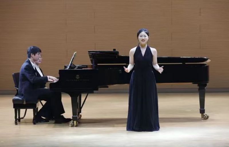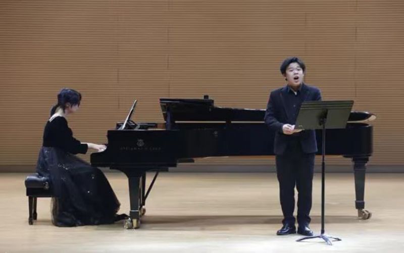音乐会在饱含希望的序曲中缓缓拉开帷幕。首演曲目《向上,少年》由社会教育培训中心研究员王珉珠作词、高一二班何欣怡作曲,高二四班王思雯倾情献唱,作曲者何欣怡亲自担任钢琴伴奏。作品以鲁艺精神传承为内核,旋律激昂向上,生动展现了新时代青年勇担使命、奋勇争先的精神风貌。