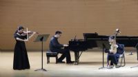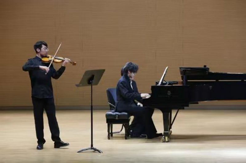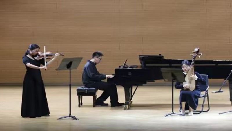 器乐作品同样精彩纷呈、意蕴深远。高一二班黄添翼作曲的《春泥弦语》由高一二班翟德栋(小提琴演奏)与高一一班金禹圻(钢琴演奏)联袂呈现,弦乐的婉转与键盘的灵动交织碰撞,以"春泥护花"的意象喻指无私奉献的品格,用"弦语传情"的表达传递廉洁心声,寓意廉洁之花在青春校园绚烂绽放。高二合班冯曦冉作曲的三重奏《舞》独具匠心,将小提琴(高二合班李迎春演奏)的悠扬、钢琴(高二合班冯曦冉演奏)的灵动与琵琶(高三年级覃天玥演奏)的典雅巧妙融合,以跨界艺术手法回望君子宁折不弯的清廉风骨,展现了青年一代对廉洁信仰的执着追求。