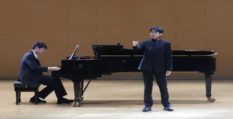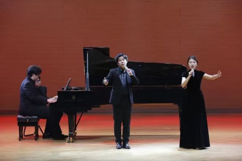 音乐会在歌曲《不忘初心》的雄浑旋律中接近尾声。高二四班王路德、田子禾的深情演唱与高三年级何金航的精湛钢琴伴奏相得益彰,以真挚的情感诠释了"不忘初心、方得始终"的信念誓言,为整场演出画上了浓墨重彩的句号。