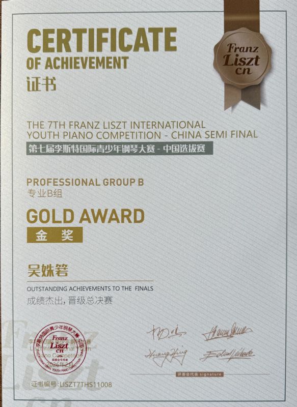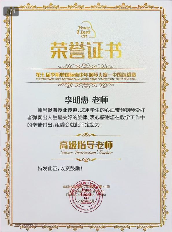 我校键盘学科初三二班吴姝箬同学(指导教师:李明惠副教授)在2025年11月举办的第七届李斯特国际青少年钢琴大赛沈阳赛区初赛中获得一等奖,获得晋级中国选拔赛的资格。2026年2月吴姝箬同学又在中国选拔赛中再创佳绩,荣获专业B组金奖并且晋级全球总决赛。指导教师李明惠获高级指导老师奖。