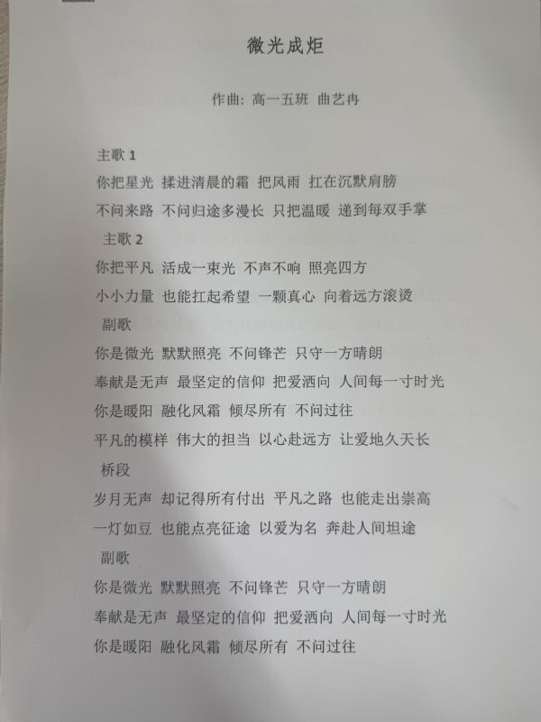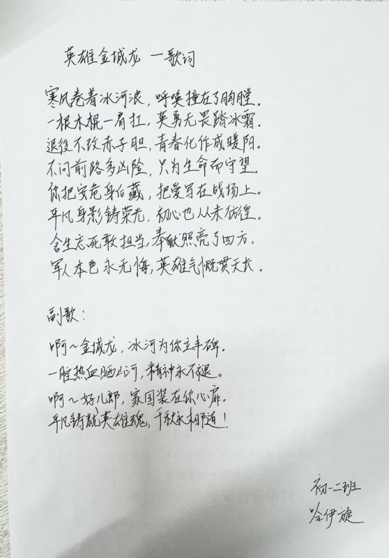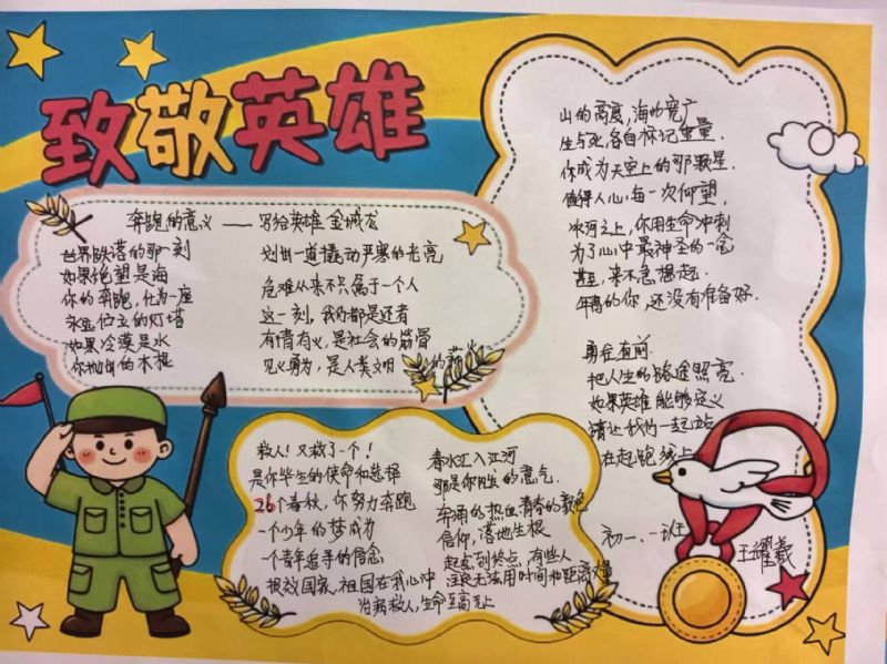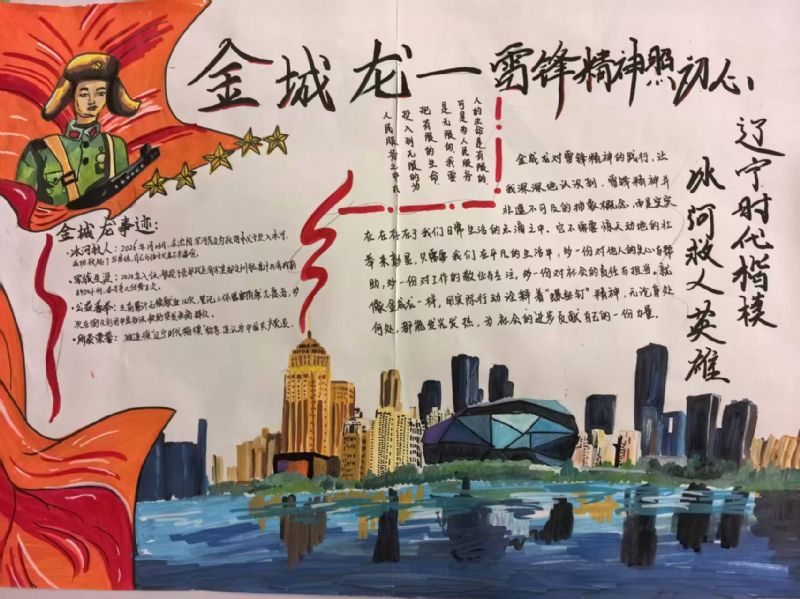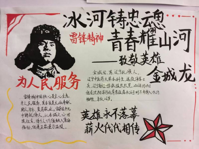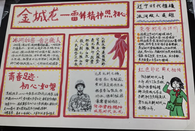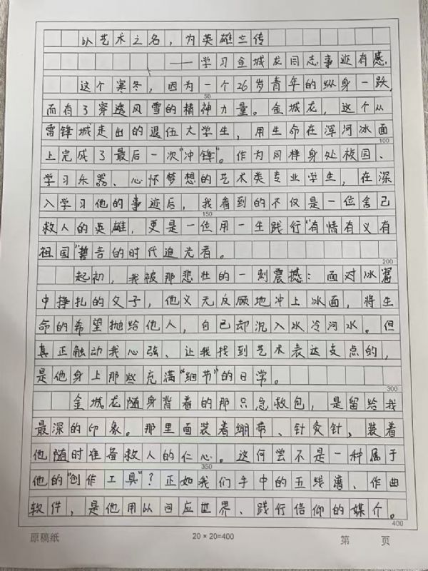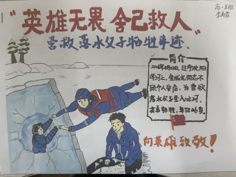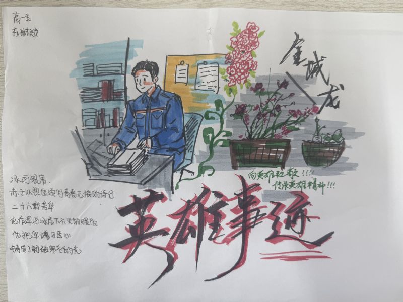 成果提交阶段,同学们以笔为媒、以艺传情,积极参与多元成果创作。大家不仅认真完成真情感悟文章,诉说对英雄的崇敬与感悟,更结合自身专业特色,创作出主题鲜明、情感真挚的艺术作品:作曲专业学生撰写歌颂奉献精神的歌词曲谱,用创作表达情怀;器乐专业学生创作演奏致敬英雄的旋律,用灵动音符诠释担当;演唱专业学生录制致敬英雄的歌曲,用悠扬旋律传递敬意;有的学生则通过插画、漫画、短视频脚本、手账海报等形式,生动再现金城龙同志的先进事迹。各班主任认真收集、分类整理学生作品,筛选出一批立意深刻、贴合专业特色的优秀作品,形成班级优秀作品清单,为后续成果展示奠定了坚实基础。