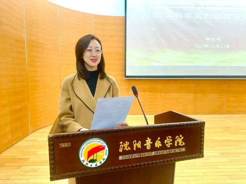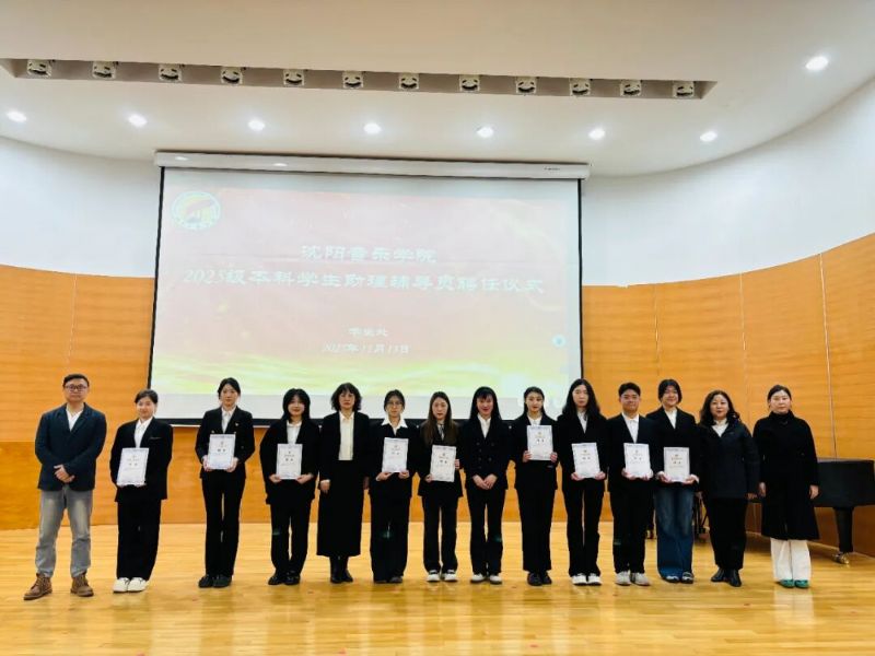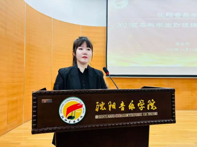11月13日,沈阳音乐学院2025级本科学生助理辅导员聘任仪式在三好校区室内乐演奏厅举行。学生处处长王爽,各二级院(系)党委、党总支(直属党支部)书记、副书记、学生管理科科长,2025级新生辅导员、17名助理辅导员代表及30余名学生代表参加仪式。仪式由学生管理科科长杨智涵主持。