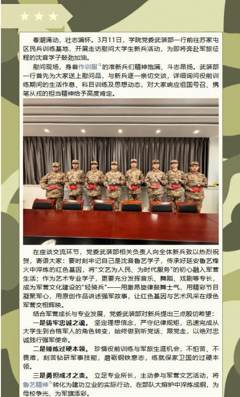 鲁艺初心映戎装,艺心向党赴军营——学院党委武装部赴春季新兵训练基地开展慰问活动