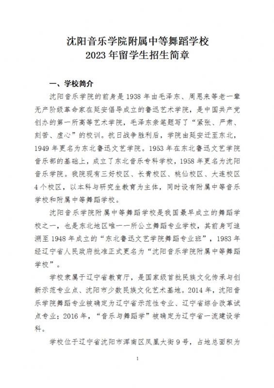 沈阳音乐学院附属中等舞蹈学校2023年留学生招生简章