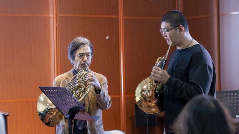 馬込勇教授、今濑康夫教授长期活跃于日本国内各大交响乐团,并致力于国际音乐与教育的交流与合作。在大师班上,馬込勇针对学生在吹奏巴松的技术、情感表现和气息处理等方面进行了指导。今濑康夫以圆号练习曲的演奏为线索,指导学生在吹奏时进行合理的指法变换,讲授了演奏不同音高时应注意的问题,并与我院学生共同合奏了圆号曲目。在讲学过程中,两位教授与我院师生积极互动、亲切交流,现场气氛轻松热烈,学生们了解到更多关于吹奏巴松与圆号的技巧,获益良多。