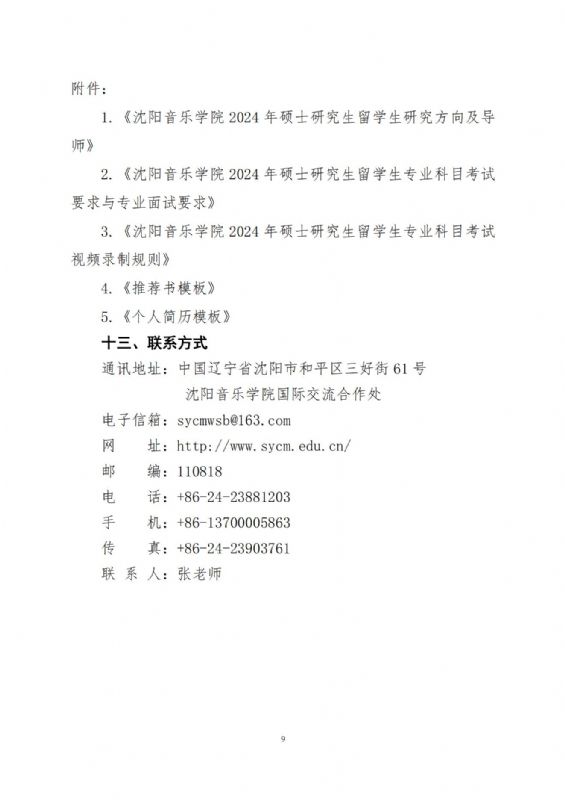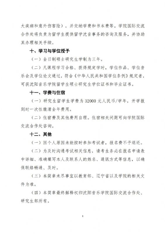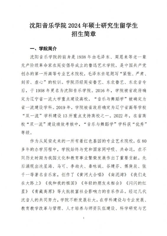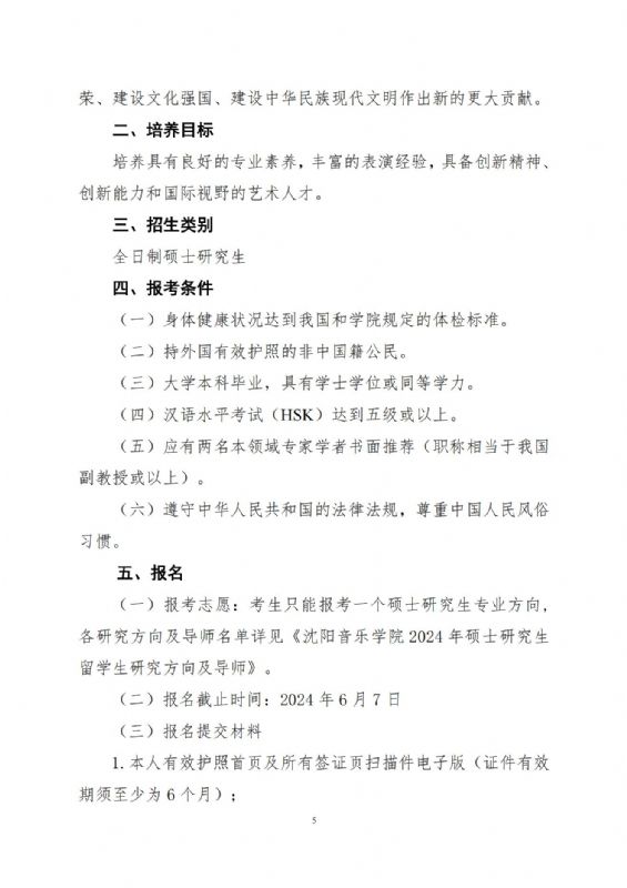 沈阳音乐学院2024年硕士研究生留学生招生简章