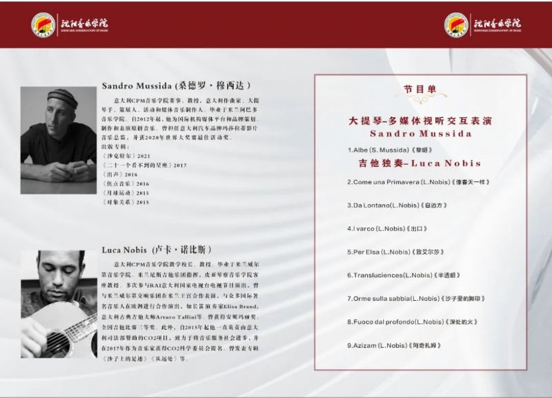 音乐会以桑德罗·穆西达(Sandro Mussida)的《黎明》揭开序幕。作为CPM音乐学院董事,教授,作曲家和大提琴家,他用灵动的大提琴旋律与媒体图像视频交互相融,把观众带入了一个全新的音乐领域。接着,卢卡·诺比斯(Luca Nobis)带来了吉他独奏。作为CPM音乐学院教学校长、教授,他为观众带来了自己创作的作品《像春天一样》、《自远方》、《出口》、《致艾尔莎》、《半透明》、《沙子里的脚印》、《深处的火》和《阿奇扎姆》等八首作品,以吉他的悠扬琴音引领观众走入一个充满诗意的音乐世界。音乐会在卢卡·诺比斯(Luca Nobis)的《阿奇扎姆》中落下帷幕,独特的吉他旋律与细腻的演奏技巧,赢得了观众的阵阵掌声。