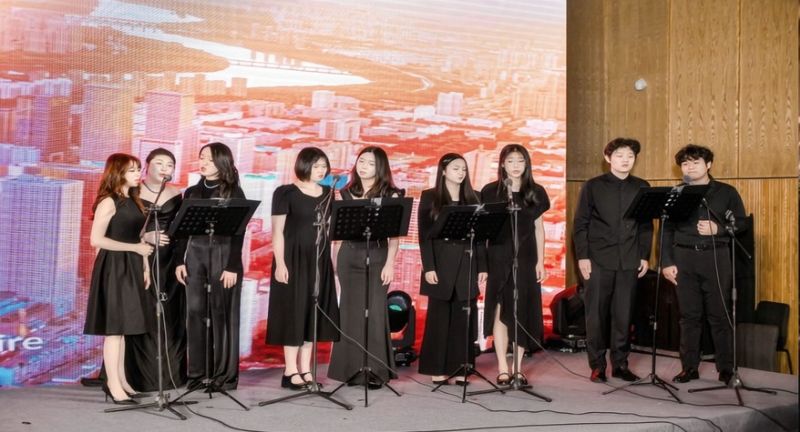 在活动“艺术开篇”环节中,我院作曲系视唱练耳教研室主任、副教授、研究生导师丛韵涵带领作曲系旋转木马合唱团,首演了原创混声合唱作品《沈阳暖阳》。该作品由丛韵涵作词、作曲,并与黄河老师共同完成合唱改编与钢琴伴奏创作。演出中,合唱团以精湛的多声部技巧和饱满的艺术表现力,生动勾勒出温暖昂扬的旋律线条,歌词内容深刻展现了沈阳开放、友好、奋进的城市形象。作品与辽宁歌舞团呈现的民乐合奏《新赛马》、中国舞《金步摇》交相辉映,共同为中外嘉宾带来一场视听盛宴,现场反响热烈,掌声不绝。此次演出是旋转木马合唱团继参演中央音乐学院“2024中法视唱练耳国际交流研讨会”开幕演出后,又一次在国际性舞台上精彩亮相,充分彰显了我院师生扎实的专业素养与艺术团队持续活跃的国际交流能力。