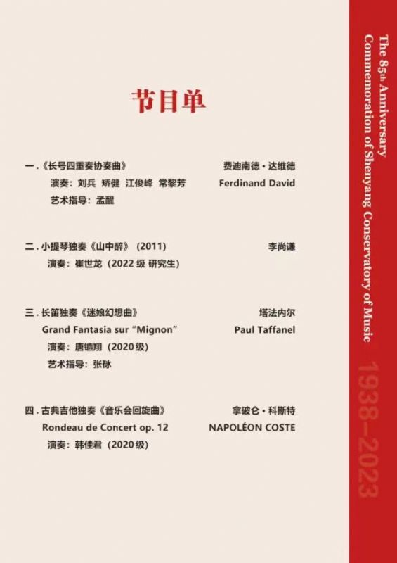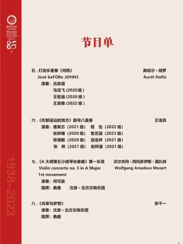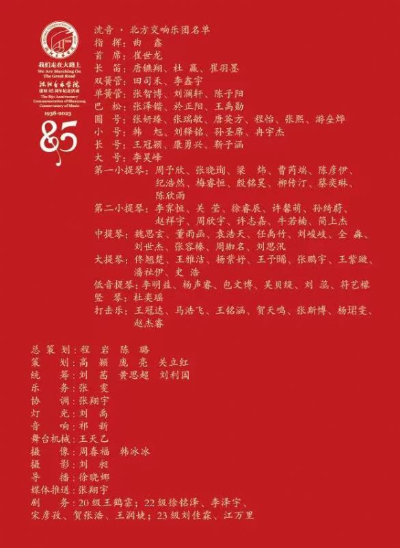 音乐会名称:“我们走在大路上”—沈阳音乐学院建校85周年纪念活动——管弦系优秀师生音乐会音乐会