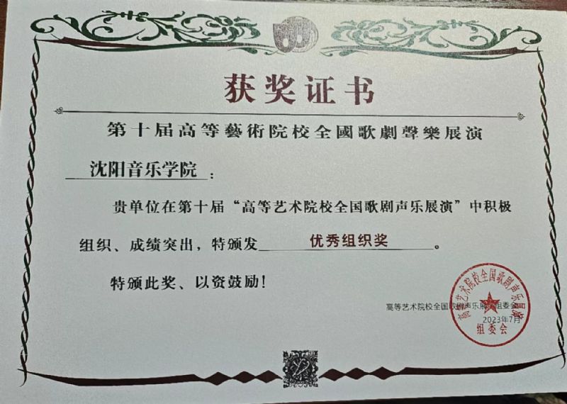 第十届高等艺术院校全国歌剧声乐展演沈阳音乐学院荣获优秀组织奖