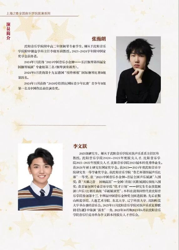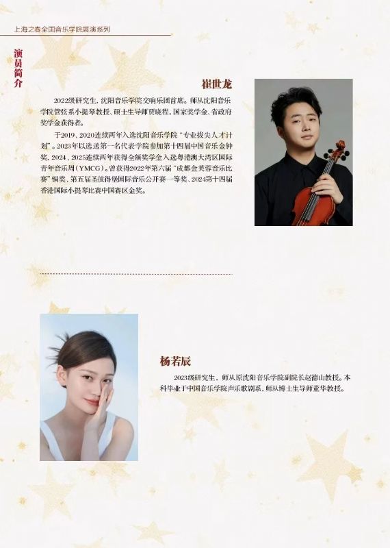 2025 年春季,音乐艺术的蓬勃朝气如潮水般席卷而来。在国内顶尖音乐院校的舞台上,一场场极具影响力的音乐盛事相继拉开帷幕。沈阳音乐学院2025春季演出季,以赴上海音乐学院,开展《上海之春音乐节系列活动之“闪耀新星”—沈阳音乐学院专场音乐会》作为开篇,正式激情启幕 。