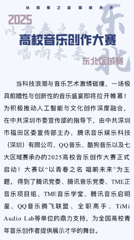 当科技浪潮与音乐艺术激情碰撞,一场极具前瞻性与创新性的音乐盛宴即将拉开帷幕!为积极推动人工智能与文化创作深度融合,在中共深圳市委宣传部的指导下,由中共深圳市福田区委宣传部主办,腾讯音乐娱乐集团(TME)旗下QQ音乐、酷狗音乐联合全国高校共同承办的2025高校音乐创作大赛正式启动。