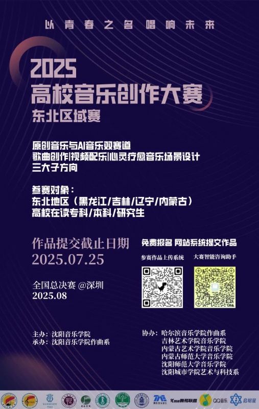 我们期待,通过这场大赛,诞生一批具有时代影响力的音乐佳作,让音乐与科技共同书写时代新篇章。2025高校音乐创作大赛,诚邀你的参与!一起用音符拥抱未来,用创新定义音乐!