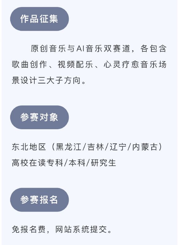 鼓励用音乐创作、使用AI为当代快节奏生活下努力奋斗的人们舒压,自由创作节奏舒缓、具有舒压功能的纯音乐即可,关注学生群体、就业群体的心理舒缓与疗愈更佳。