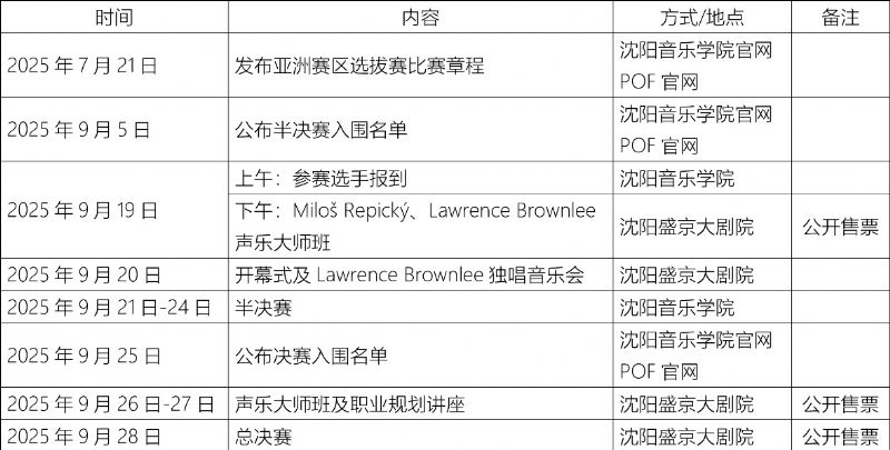 “首映歌剧”国际声乐大赛(Premiere Opera Foundation International Vocal Competition)是全球声乐歌剧界最具权威的赛事之一,已成功在纽约卡内基音乐厅、林肯中心举办了八届,以专业权威性高、选拔机制公平严谨著称。获奖者将拥有与国际著名剧院签约机会及全球巡演资源,是声乐歌剧新星和未来国际歌剧巨星的重要起点和成长平台。本年度,该赛事首次设置亚洲赛区选拔赛,由首映歌剧基金会(Premiere Opera Foundation,以下简称POF)与沈阳音乐学院共同主办,沈阳盛京大剧院协办,旨在发掘并推广亚洲最有前途的青年歌剧表演人才。