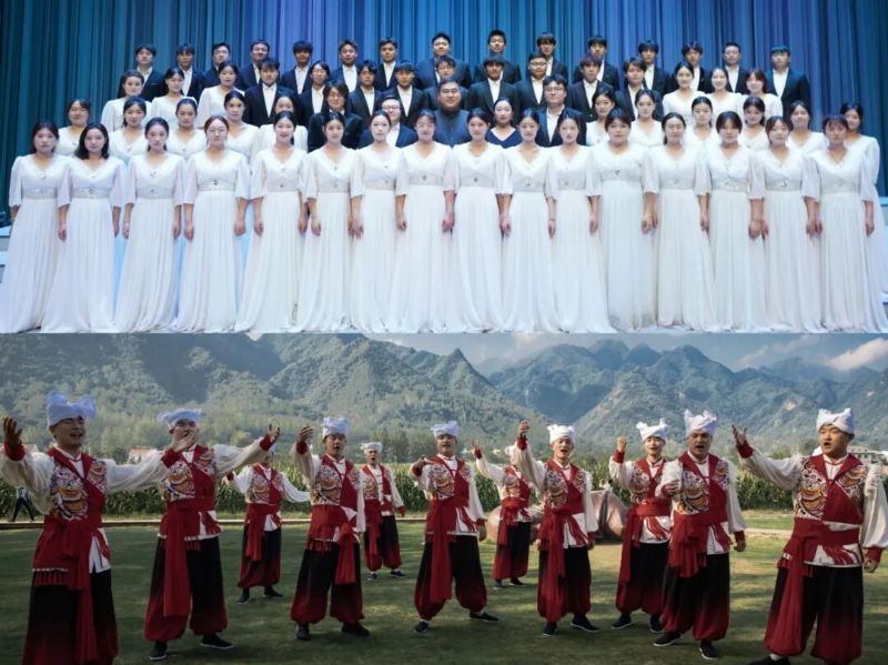本场“声韵长河”合唱音乐会分为上、下半场。上半场宁夏师范大学灵瑞合唱团的演出将宁夏花儿、甘肃花儿、青海民歌以及六盘山地区社火等非物质文化遗产元素巧妙融合。作品既有对民间音乐“花儿”的改编再创作,也有对诗词入乐的艺术探索,展现了浓郁的地域特色与深厚的文化底蕴。音乐风格兼具高亢嘹亮的山歌韵味与细腻深沉的情感表达,既保留了原生态的质朴之美,又融入现代合唱的和声技巧。下半场是由西安石油大学男声合唱团以陕北民歌为核心,通过现代合唱艺术语汇,展开的一场跨越时空的对话。演出聚焦陕北民歌的原始生命力与文化深度,以男声合唱再现黄土高原的精神图谱,展现传统民歌与现代编创的相映生辉,以此实现非遗的“活态传承”。