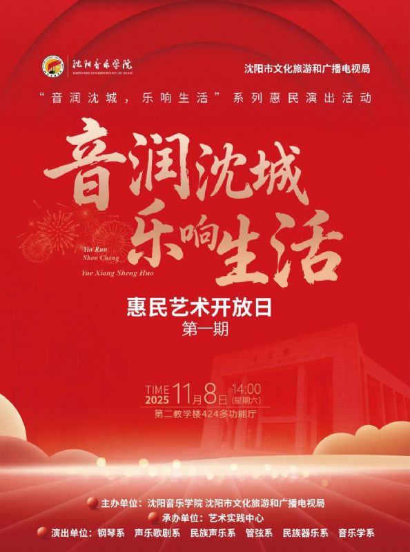 系列惠民演出活动是沈阳音乐学院赓续“艺术为人民服务”鲁艺光荣传统,充分发挥学院资源优势,服务市民文化生活的务实举措。学院将通过建立惠民演出常态化机制,将优质艺术资源带入城市生活,为广大市民开放免费欣赏高雅艺术的窗口。此举旨在丰富大众精神世界,提升审美素养,是沈阳音乐学院主动融入并服务沈阳城市文化建设,挖掘鲁艺红色经典、传承地方优秀文化、弘扬特色地域文化的有力实践。