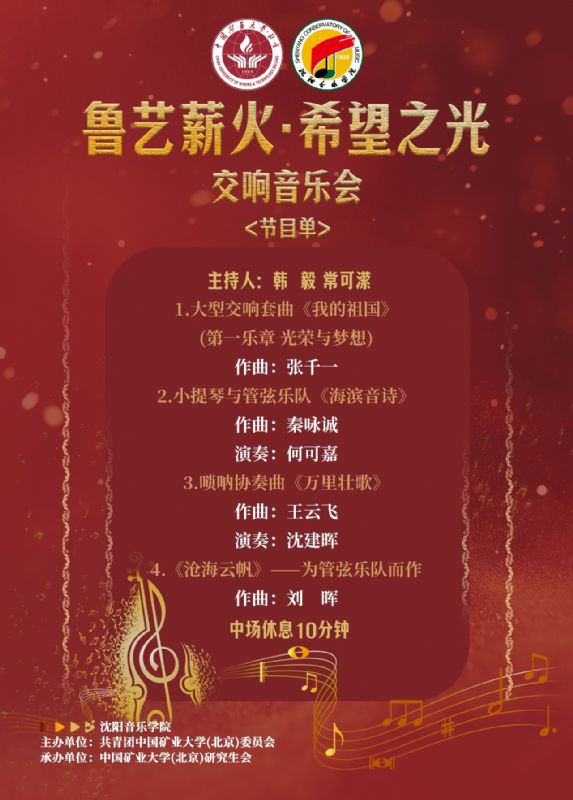 中国矿业大学(北京)团委特邀沈阳音乐学院的师生们倾情呈现 “鲁艺薪火·希望之光”交响音乐会。让我们共赴这场秋日音乐之约,在旋律的起伏中,感受光荣与梦想,汲取奋进的力量。
