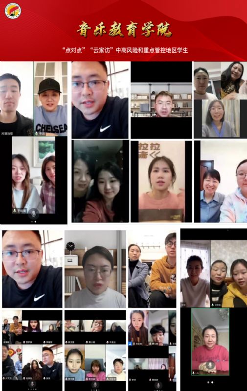 各系党支部书记及13名辅导员,针对24名中高风险和重点管控地区学生、7名集中隔离学生进行“点对点”“云家访”。在疫情隔离的日子里,老师们用视频叩开了学生们的家门,和学生及家长云端相聚,心与心交流。老师们转达了学院领导对他们的关心和关爱,同学们纷纷向老师汇报了各自的思想状态、学习情况和家庭情况,并感谢抗疫一线的医护工作者和志愿者们细致入微的照顾。2020级民族声乐教育系学生付中娇同学、键盘器乐教育系曾惠予同学,在集中隔离期间与老师连线时说,她们深深感受到了学校老师的付出与关爱,更感受到了学院领导的关心与温暖,表示今后要努力学习,将来回报社会,回报祖国。