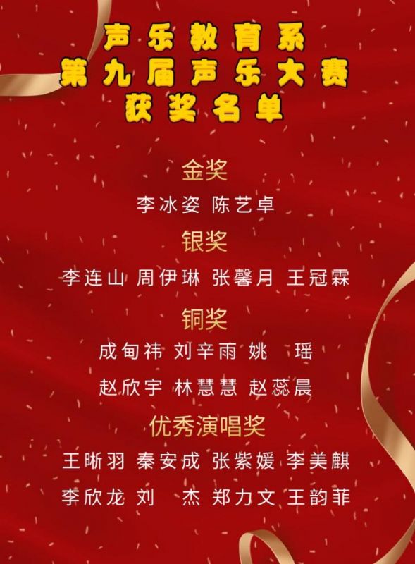 本次比赛涵盖了红色经典歌曲、艺术歌曲、歌剧咏叹调等中外各种艺术体裁作品,充分展示了选手们的演唱技巧与我系的专业教学水平。最终评选出金奖两名、银奖四名、铜奖六名、优秀演唱奖八名。声乐教育系将择期举办获奖选手颁奖音乐会。