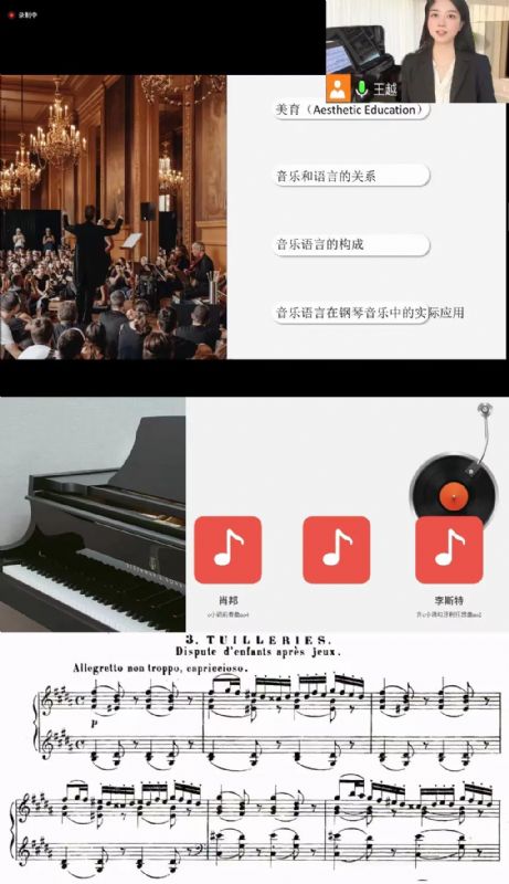 此次公开课以时下全民美育的话题为切入点,精心挑选古典时期钢琴音乐作品为素材,从音乐本身出发,以“音乐语言理解音乐”、用“学习语言的方式学音乐”,结合演奏钢琴音乐作品乐句片段、分析谱例等方法,为同学们通俗易懂地讲解了美育视野下音乐学习和音乐表演的新角度。王越老师用俄语和法语的语调特点分别举例说明了两国民族音乐作曲者在钢琴音乐作品中使用的音乐语言和母语语调存在的听想关系。并从“二度”关系的不同组合方式,带领同学们分析了肖邦《e小调前奏曲》以及李斯特《匈牙利狂想曲no.2》的主题动机。以穆索尔斯基的钢琴组曲《图画展览会》向大家展示了音乐语言中“联觉”这一语言构成要素。