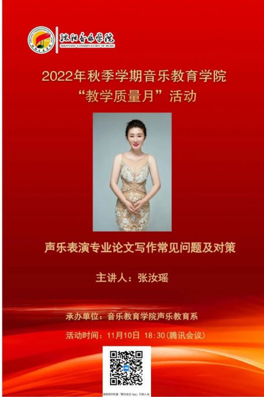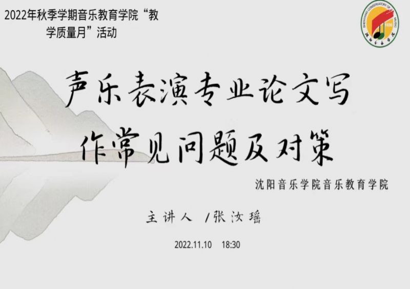 2022年11月10日,声乐教育系举办了由张汝瑶教授主讲的公开课《声乐表演专业论文写作常见问题及对策》。本次公开课旨在对毕业生论文撰写提供指导。