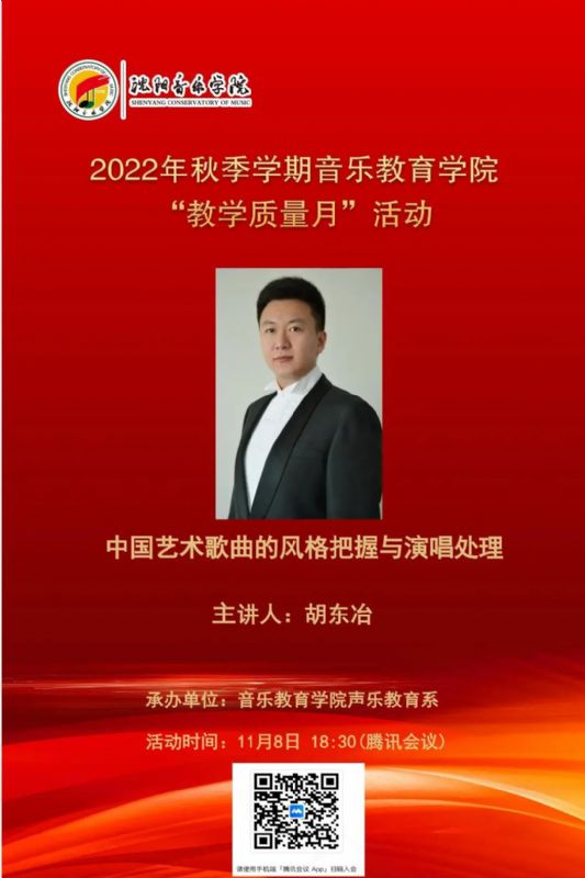 2022年11月8日,音乐教育学院声乐教育系举办了由胡东冶老师主讲的公开课《中国艺术歌曲的风格把握与演唱处理》。声乐教育系李明月副主任表示,本次公开课的主要目的是为了加强学生对歌曲的整体把握,提升学生对歌曲情感的处理,以便提高学生对歌曲演唱的能力和水平。